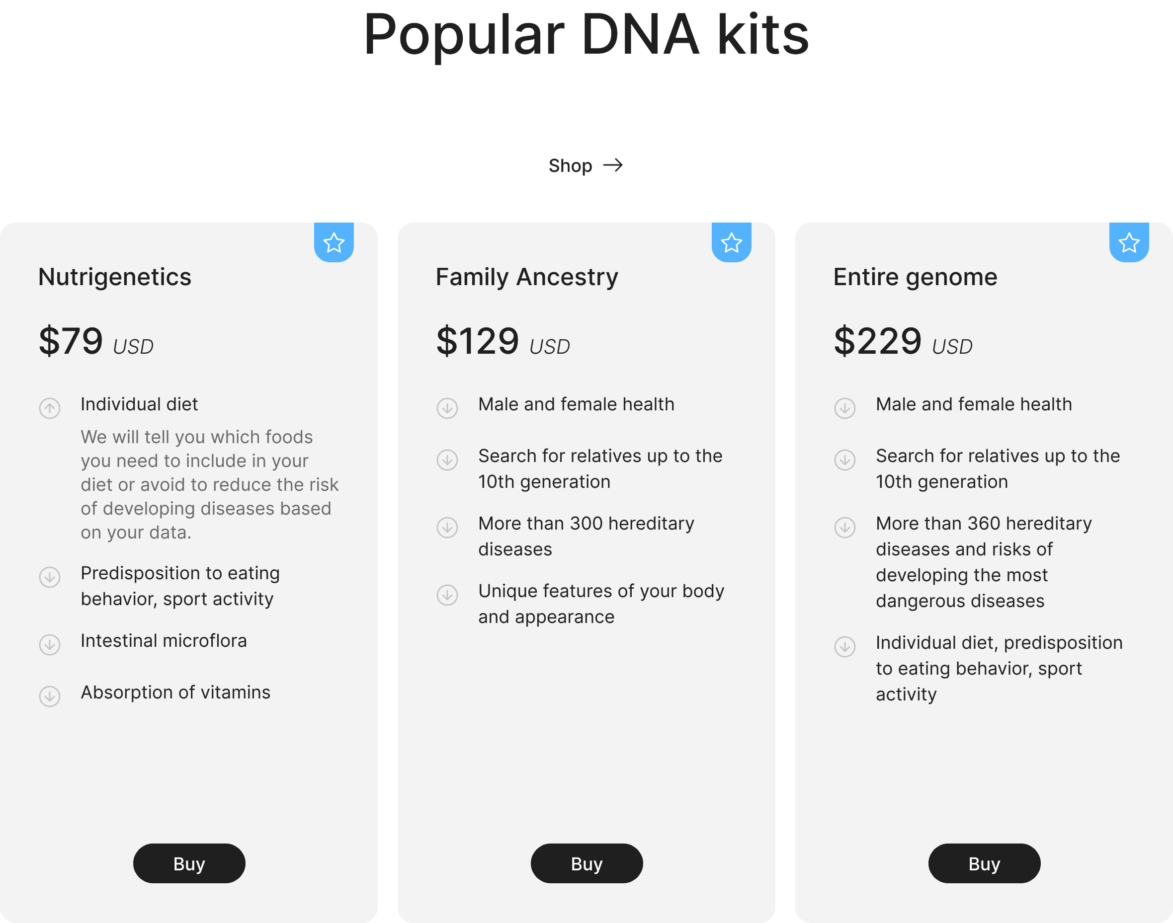 Block for comparing tariff plans. Includes cards, buttons and accordions to detail each sentence